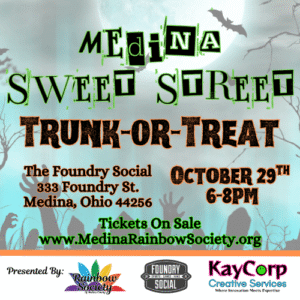 The Rainbow Society of Medina County invites you to join Sweet Street – Trunk-or-Treat Fundraiser at The Foundry Social on October 29, 2025, 5:00–8:30 PM.